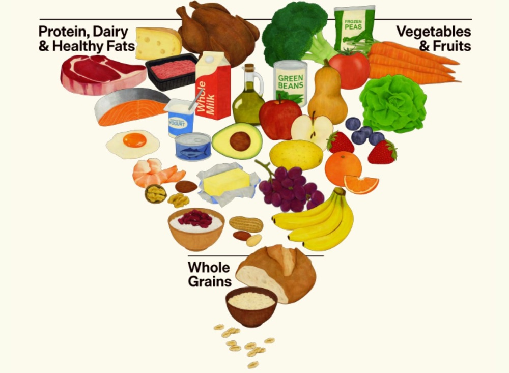 Nove prehranske priporočila, objavljena 7. januarja, ki zagovarjajo povečan vnos beljakovin in zdravih maščob ter zmanjšujejo vnos žit, se razlikujejo od prejšnjih vladnih smernic. Dejansko je priložena vizualna predstavitev prehranske piramide skoraj popolnoma nasprotna tisti, ki je veljala doslej – tako vizualno kot vsebinsko.
